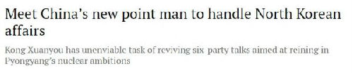 日前被转引最多的英文报道源自路透社14日发布的文字:中国任命了一位新的朝鲜半岛事务特别代表,由外交部部长助理孔铉佑接替已至退休年龄的武大伟。