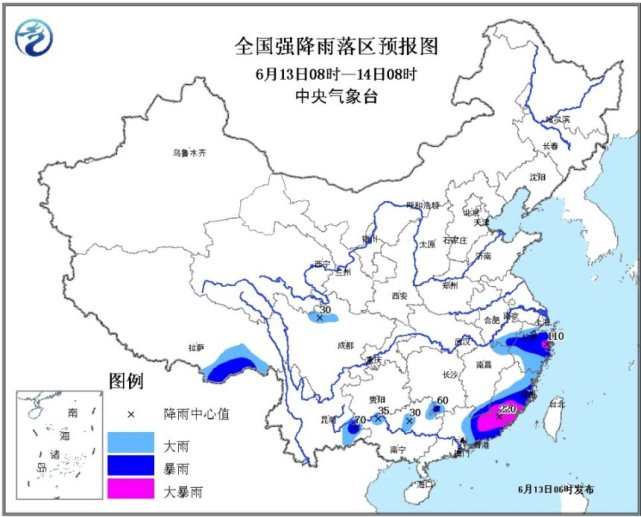 预计,6月13日08时至14日08时,广东中东部、江西东北部和南部、福建东部和南部、安徽东南部、浙江大部以及广西北部、云南东南部等地有大雨或暴雨,其中广东东部、福建南部、浙江东部等地的部分地区有大暴雨(100~220毫米);上述地区局部并伴有短时强降水、雷暴大风等强对流天气,最大小时雨强可达30~50毫米,局地超过60毫米。