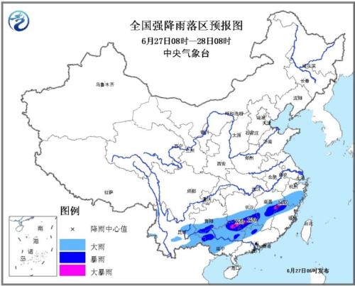 预计,6月27日08时至28日08时,广西中北部、广东北部、贵州南部、湖南中南部、江西中南部、福建北部、浙江南部、云南东部等地有大到暴雨。其中,广西东北部、湖南南部、江西东部等地局地有大暴雨(100~120毫米);上述部分地区有短时强降水、局地伴有雷暴大风等强对流天气,最大小时雨强30~50毫米,局地可超过60毫米。