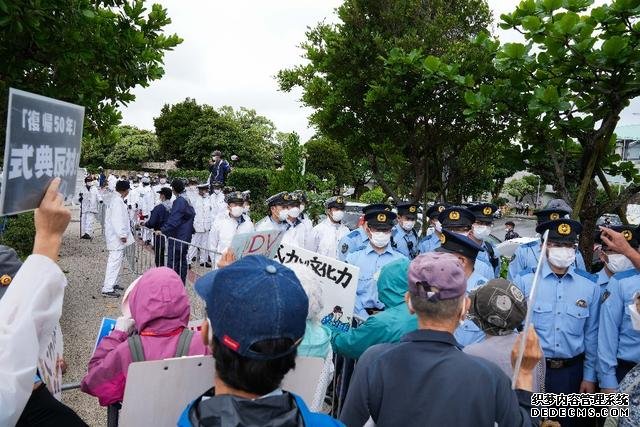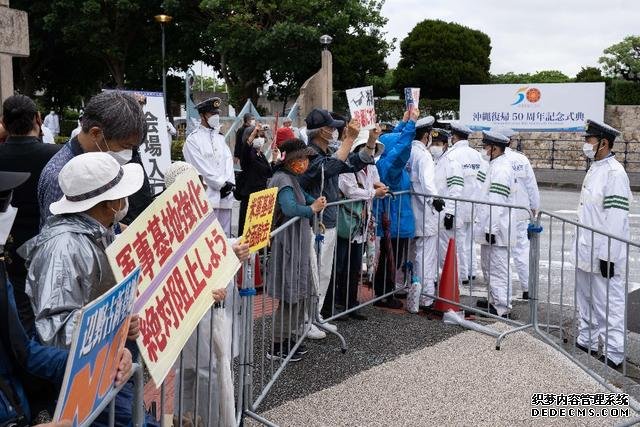 5月15日,在日本冲绳,人们在冲绳回归日本本土50周年纪念仪式现场外抗议。(新华社记者张笑宇摄)