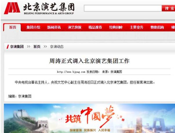 据北京演艺集团官网消息,中央电视台著名主持人、央视文艺中心副主任、安徽籍主持人周涛近日正式调入北京演艺集团,担任首席演出官。